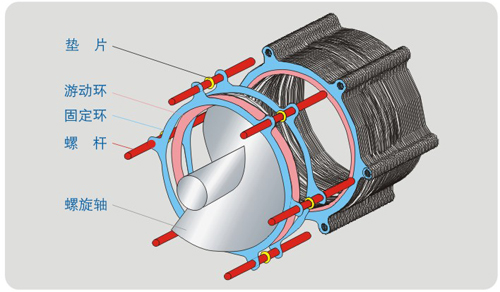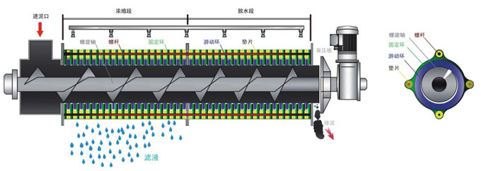 疊螺污泥脫水機是運用了螺桿擠壓原理,通過螺桿直徑和螺距變化產生的強大擠壓力,以及游動環與固定環之間的微小縫隙,實現對污泥進行擠壓脫水的一種新型的固液分離設備。